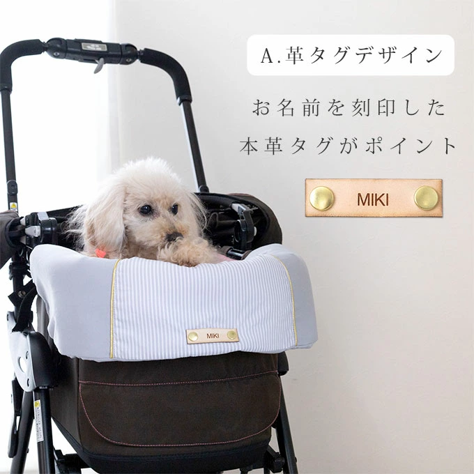 名入れ革タグはアクセントとしても美しく、子犬から成犬まで、どんなわんちゃんのカートスタイルにもマッチします。