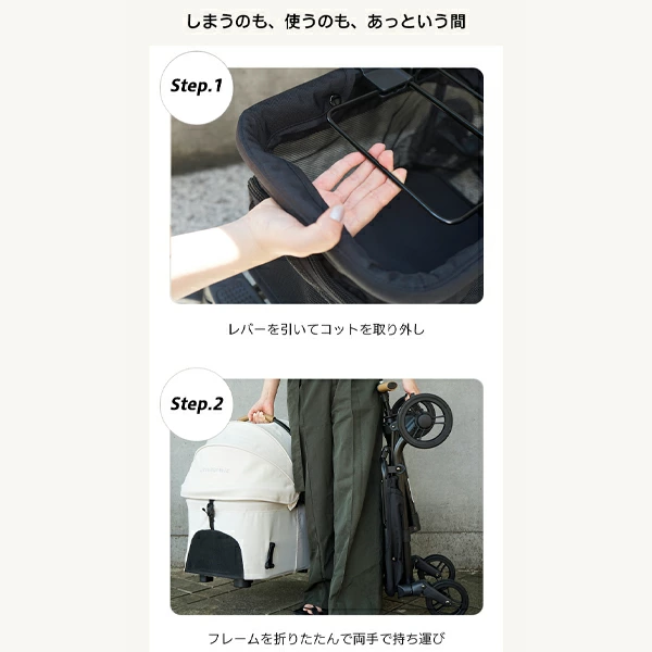 ペットカートとは思えない洗練されたデザインと機能性が両立されており、小型犬から中型犬まで、そして多頭飼いにも対応できる頼れるパートナーです。