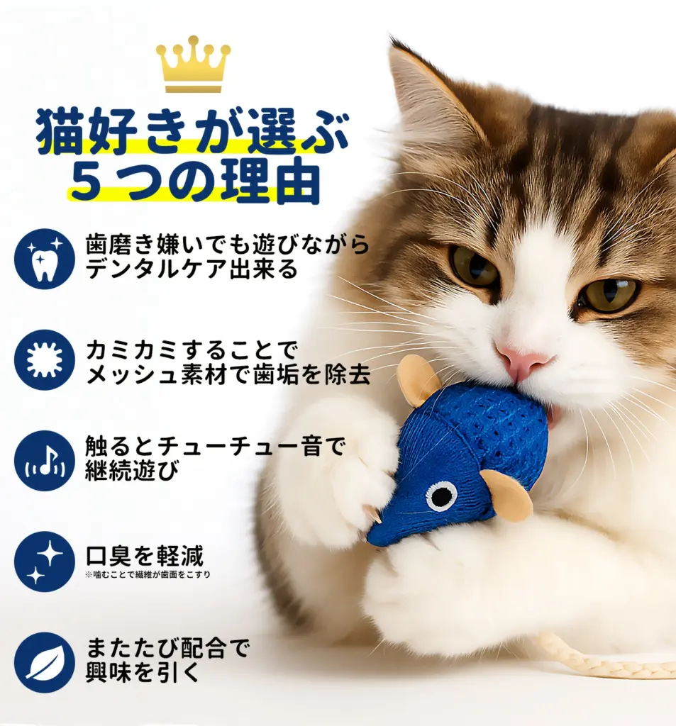 猫ちゃんがおもちゃを咥えることで汚れを絡め取り、自然とキレイになっていく仕組みです。