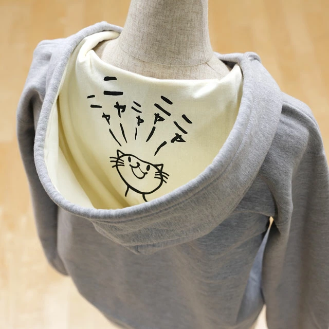 一見シンプルなフーディなのに、フードの中に「隠れた猫」が潜んでいて、猫好きなら思わずニヤリ。