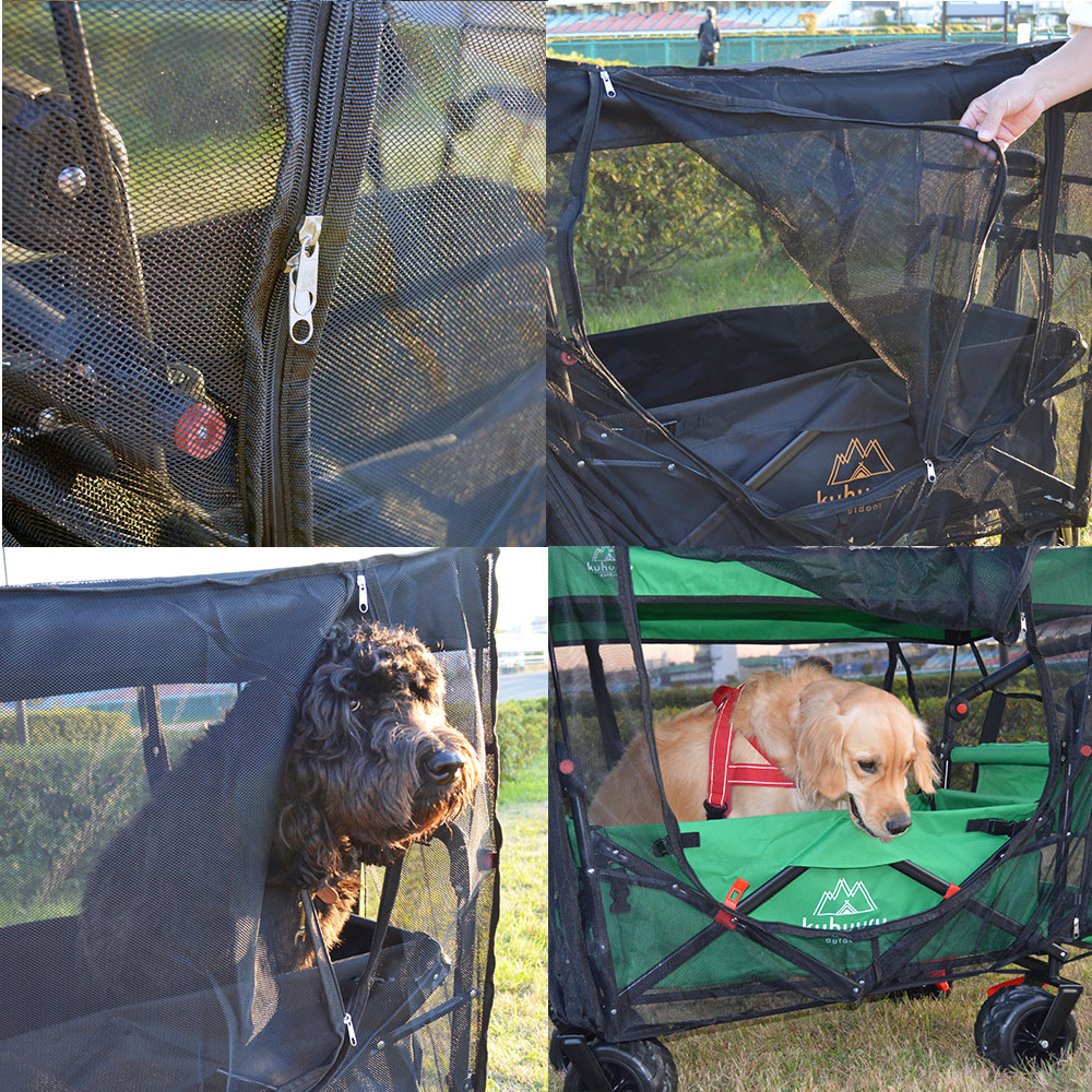 雨の日や、虫が多い季節、暑さ対策が必要な日差しの強い日などでも、ワゴン内を快適・安全に保てるため、屋外での移動やお出かけが多い飼い主さんには心強い装備です。
