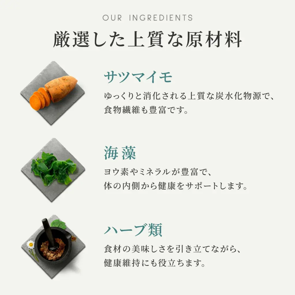 消化吸収を助けるために、プロバイオティクス(善玉菌)やプレバイオティクス、食物繊維を取り入れ、便通の改善やお腹の健やかさに配慮しています。