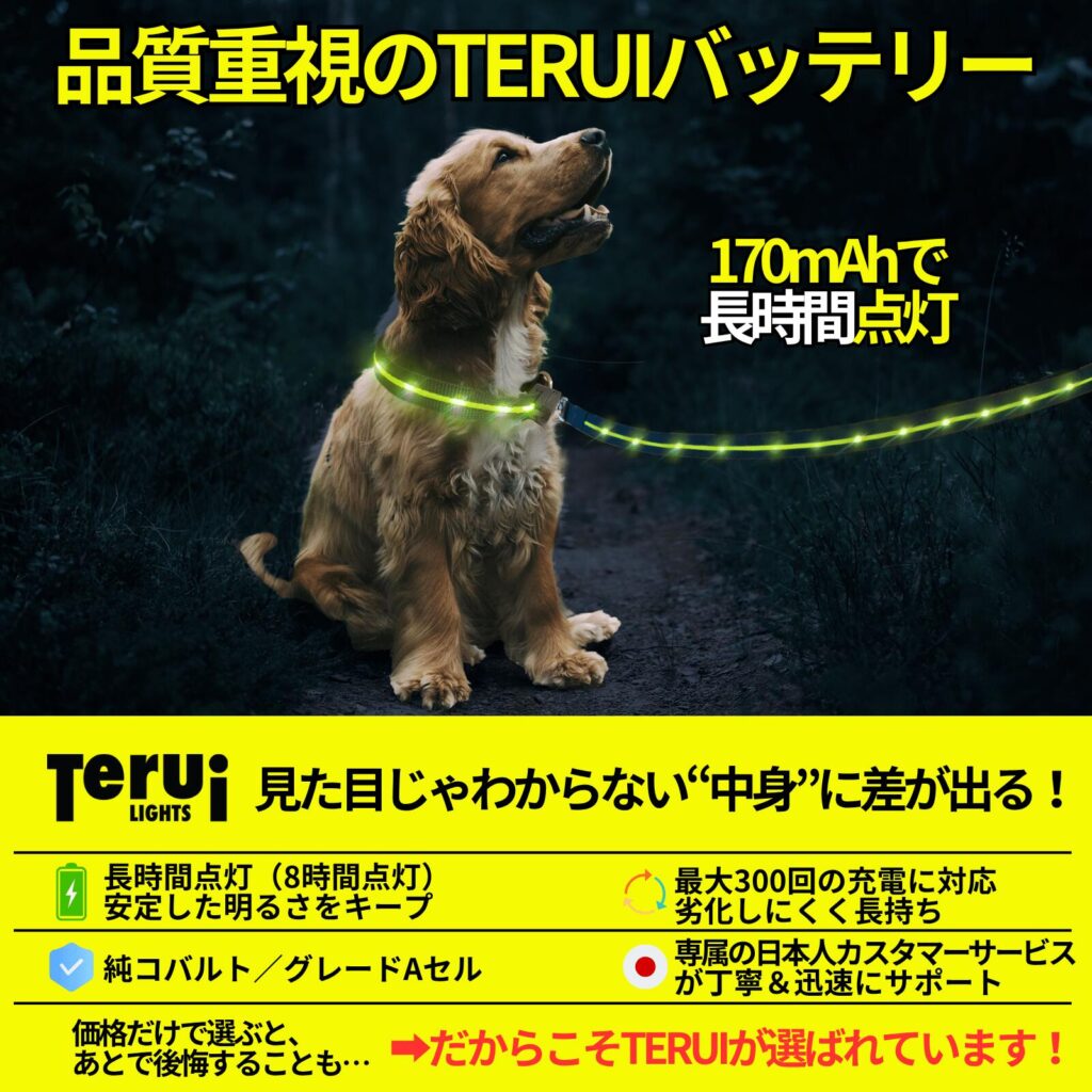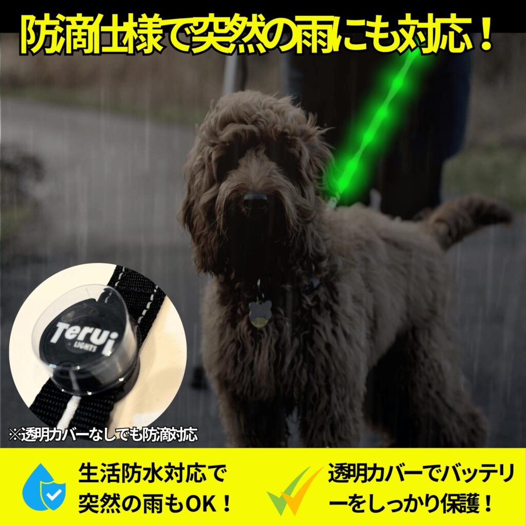 カラー展開や点灯モード(連続・点滅など)があれば、愛犬の個性も出せます。