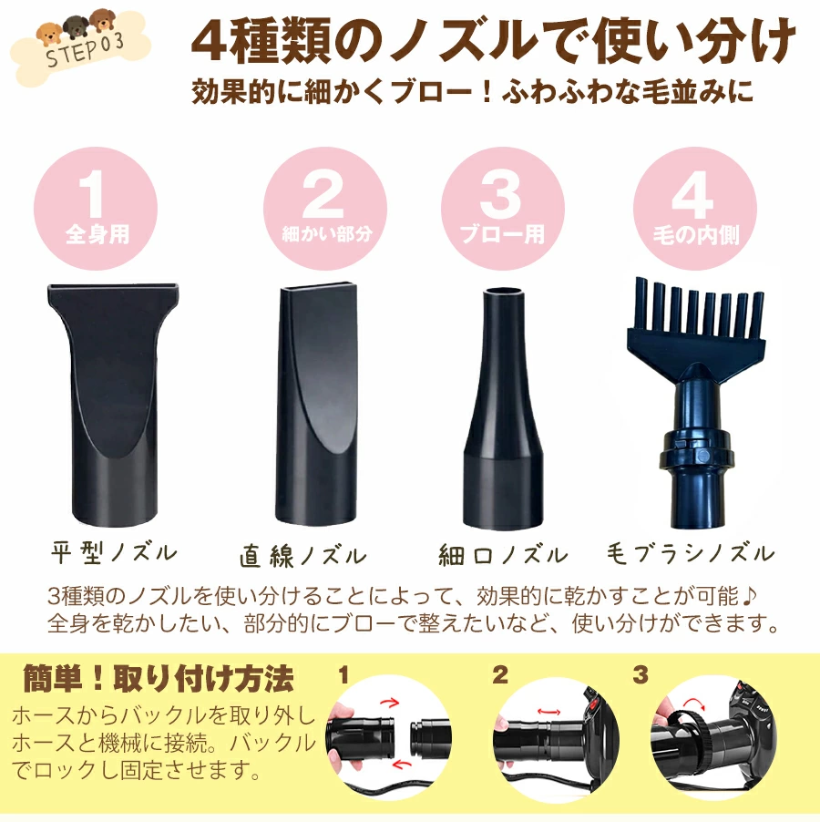 部位ごと・毛質ごとにノズルを使い分けられることで、仕上がりのクオリティも高まります。