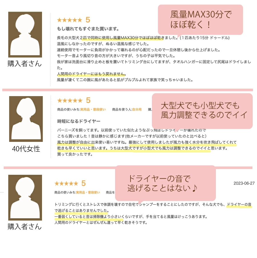 実際に「乾きが速い」「犬が嫌がらない」「音が思ったより静か」