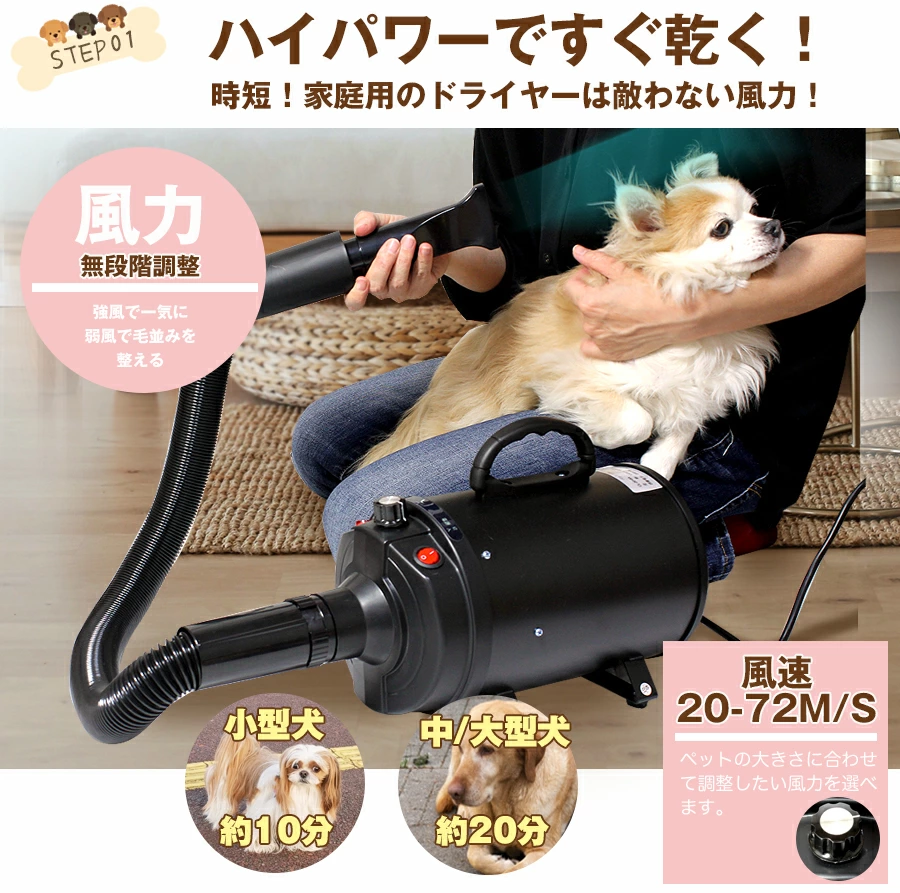 このペットドライヤーの最大の魅力は、なんといってもパワフルな72m/sの大風量。