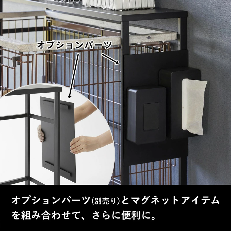 たとえばサイドに スチールパネル を設置すれば、マグネット式のトイレットペーパーホルダーやウェットシートケースなどをくっつけられます。