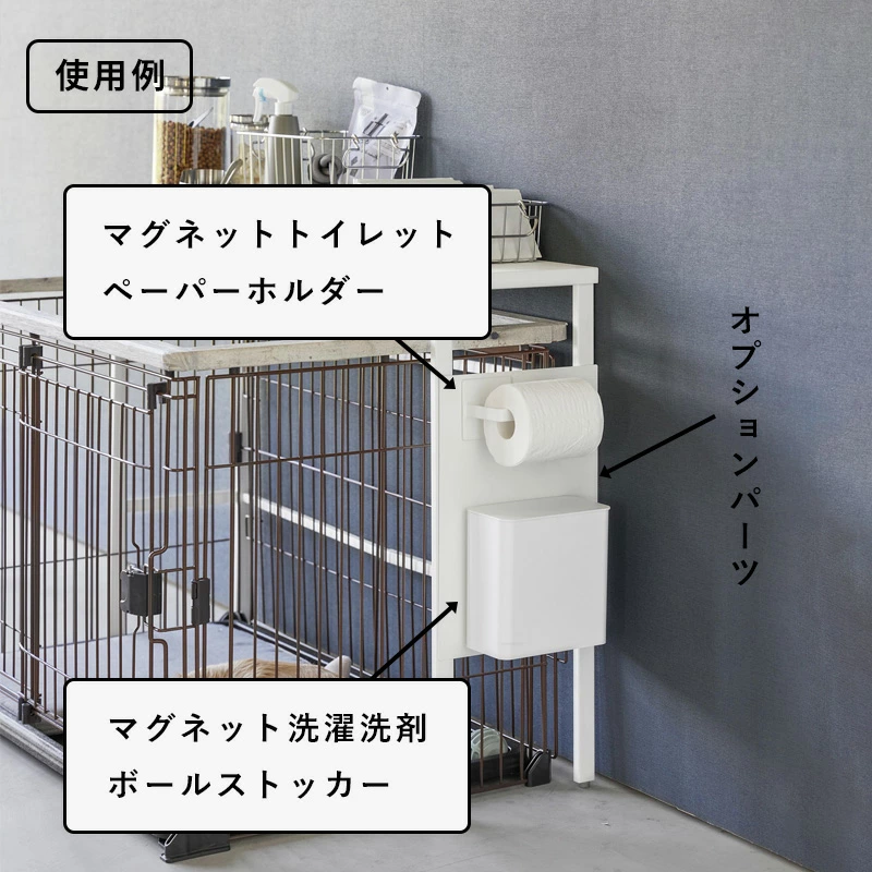ペットケージの上部を活かすだけで、おもちゃやシーツ、食事用具などをひとまとめに整理できる 山崎実業 tower 伸縮ペットケージ上ラック。