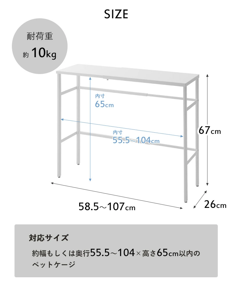 幅を 55.5cm〜104cm の範囲で伸縮可能な設計となっており、さまざまなサイズのペットサークルに対応します。