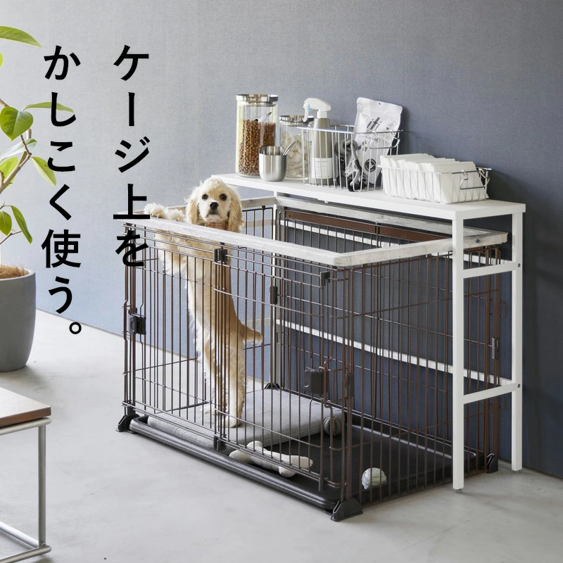 ペットケージの上部を活かすだけで、おもちゃやシーツ、食事用具などをひとまとめに整理できる 山崎実業 tower 伸縮ペットケージ上ラック。