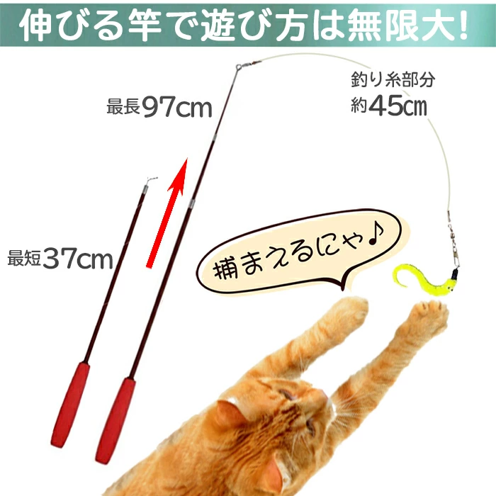 この釣り竿は長さが変えられるので、お部屋の広さや遊ぶ範囲によって調節できるのが飼い主には嬉しいポイント。